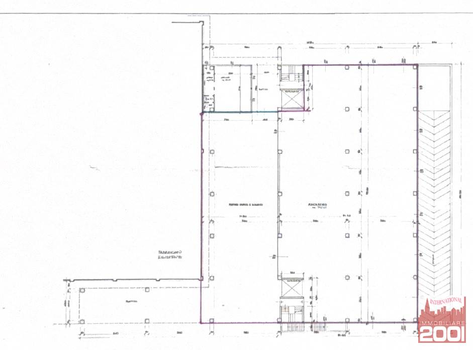 Il fabbricato principale è costituito da capannone a tre campate con due file di pilastri in cemento armato (sette pilatri per ciascuna fila), libero su tre lati, con accesso tramite grosso portone sezionale motorizzato (misure portone: altezza 5,00 m – larghezza 8,27 m).