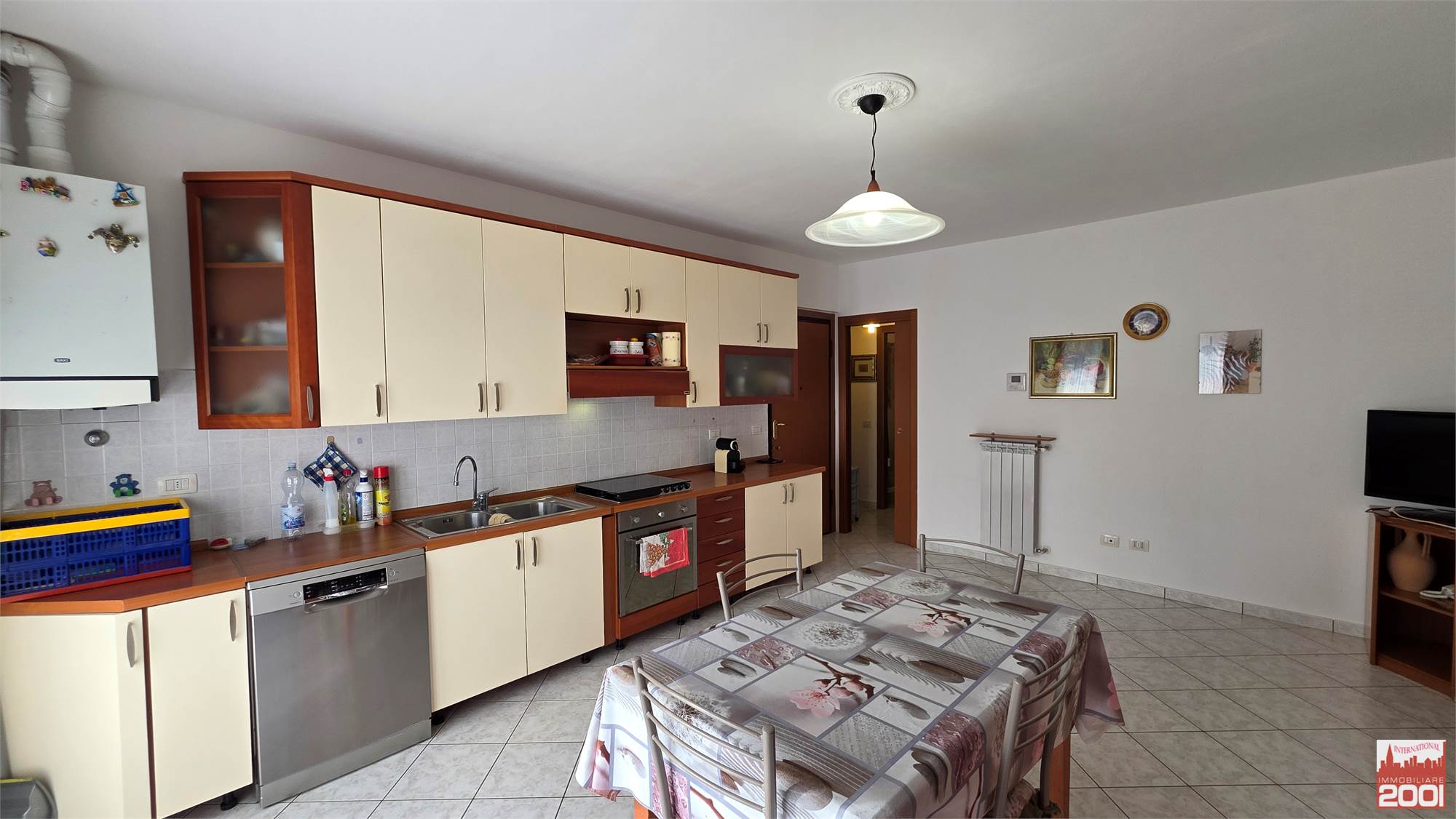 Il soggiorno con cucina è luminoso e spazioso, con una vista piacevole e un balcone dove poter godere del sole e dell'aria fresca. Il box triplo, situato al piano interrato, è dotato di cancello automatizzato e offre ampio spazio per parcheggiare tre veicoli.