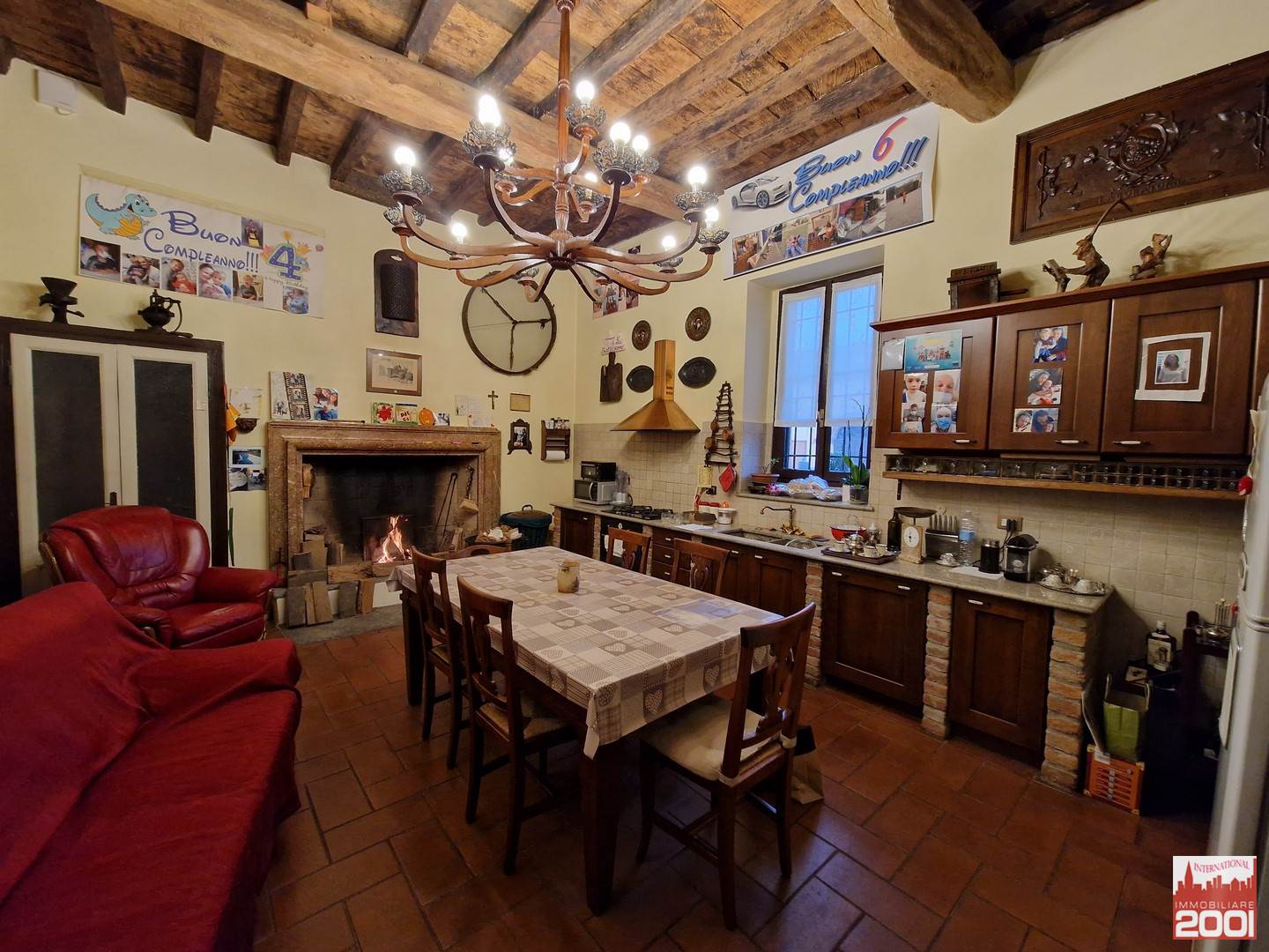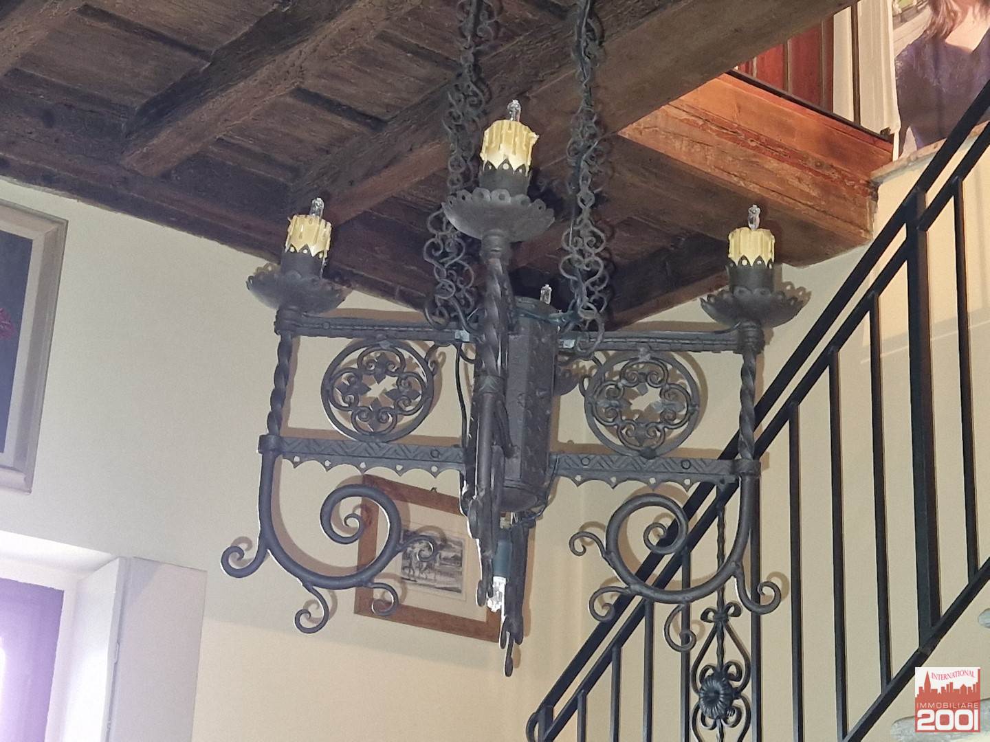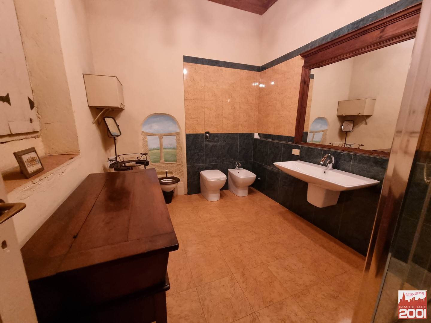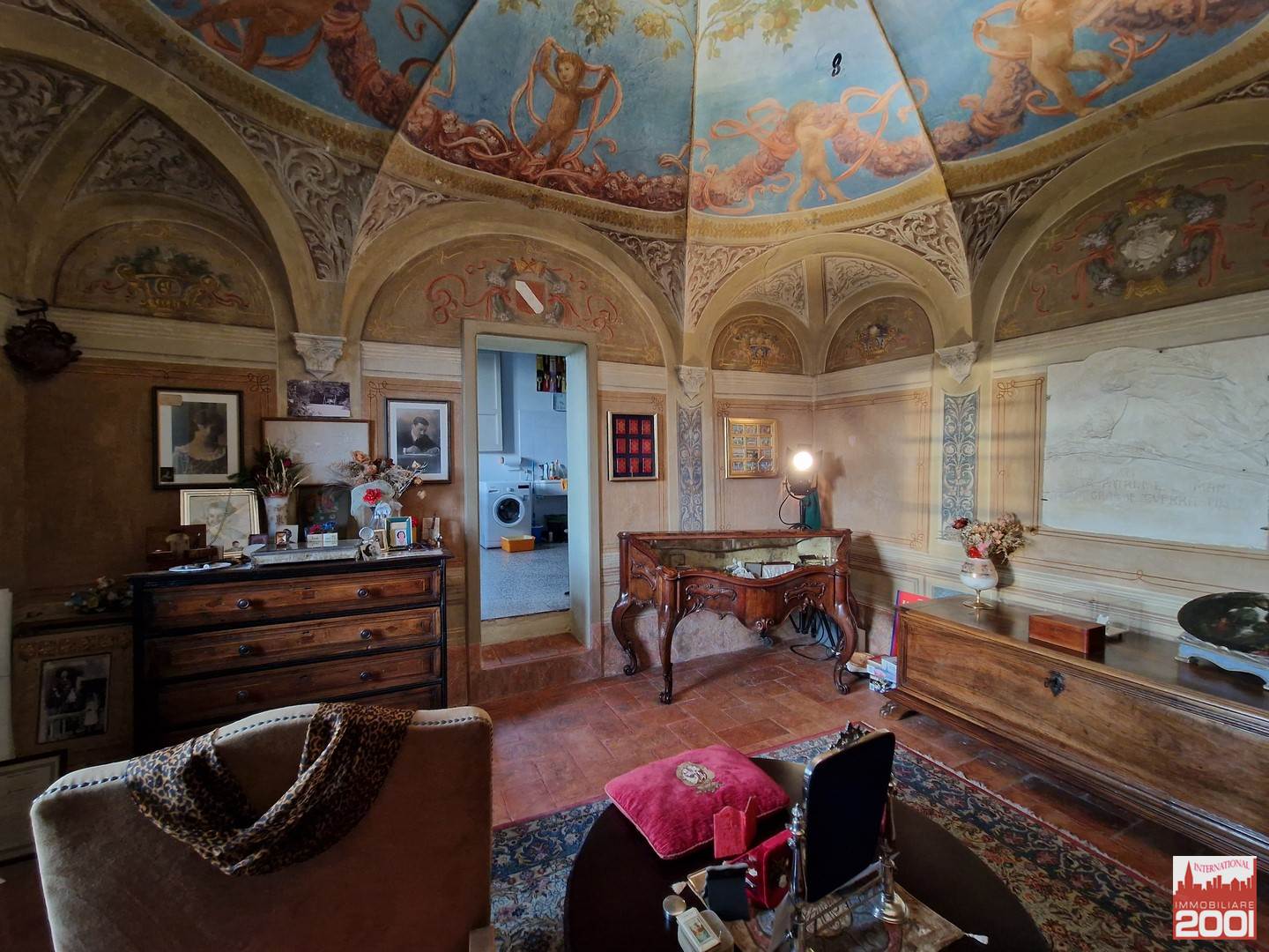 Piano primo: due camere da letto con due servizi igienici, locale studio, ampio soggiorno con coppia di importanti lampadari, stanza degli armadi seicenteschi e cucina che esce in uno spettacolare terrazzo di circa 50 mq che offre la vista sull’intera tenuta.